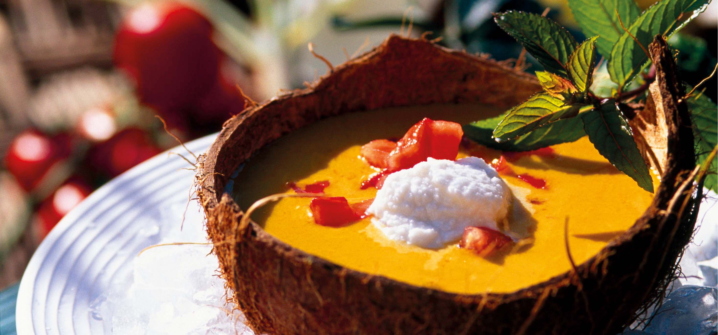 4 ausgehöhlte Kokosnusshälften oder 4 Teller