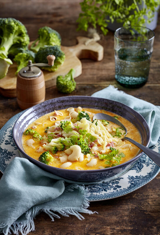 300 g Brokkoli 200 g Cheddarkäse 1 Zwiebel 2 Knoblauchzehen 1 EL Öl 125 g Schinkenwürfel 250 g Schlagsahne 1 l Gemüsebrühe Salz, Pfeffer 2 TL Paprikapulver (edelsüß) Kerbel zum Garnieren