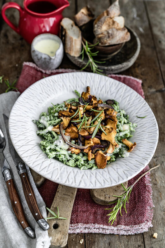 Spinatspätzle mit Pilzen und Käse